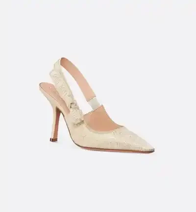 The J’Adior Slingback Pump showcases Dior savoir-faire with white cotton embroidered in gold Millefiori motif inspired by baroque art. A twotone ribbon with flat bow, 10-centimeter comma heel, goatskin lining, and calfskin sole with star emblem define the construction. Refined and expressive, it pairs effortlessly with coordinating pieces, celebrating the Maison’s elegance through craftsmanship, symbolism, and artistic heritage.