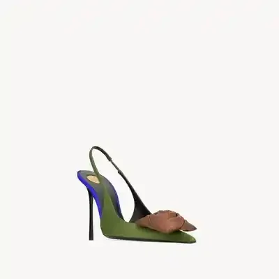 The Amalia slingback pumps feature satin crepe construction in dark olive and pecan brown, shaped into an elongated pointed toe adorned with a contrasting hand-folded square rose. A metal stiletto heel adds sculptural height, while contrasting insole trim enhances visual detail. Elegant and modern, the silhouette expresses Saint Laurent’s refined craftsmanship through bold lines and feminine structure.