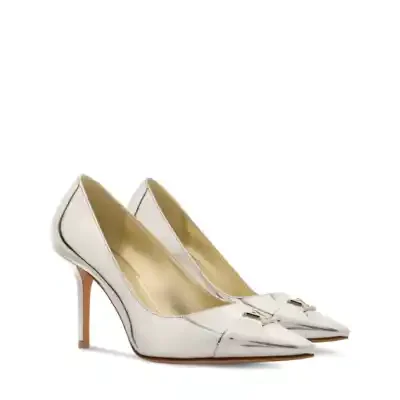 The City Pump in metallic calf leather blends glamour with architectural design. A pointed toe adorned with LV Initials and a shadow-effect signature emphasizes sculptural detail. Its flared high heel offers stability and contemporary refinement. Crafted in champagne tone with leather and rubber outsole, the silhouette embodies Louis Vuitton’s modern elegance through expressive hardware, polished lines, and luxurious Italian craftsmanship.