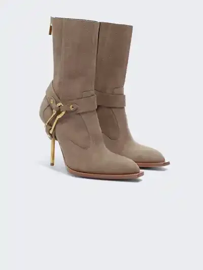 These Western-inspired ankle boots in taupe suede feature stiletto heels adorned with a rhinestone ring and a removable strap with a gold Keyhole detail. Paying homage to the Maison’s iconic symbol, they combine sculptural elegance with expressive craftsmanship. The silhouette blends refined femininity with bold attitude, highlighting Schiaparelli’s distinctive artistic codes in a modern, statement-making boot.